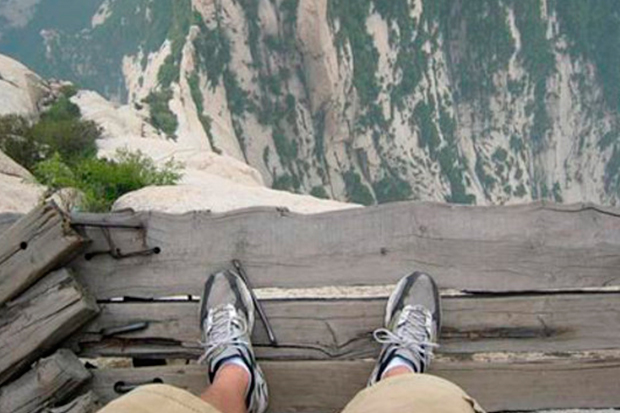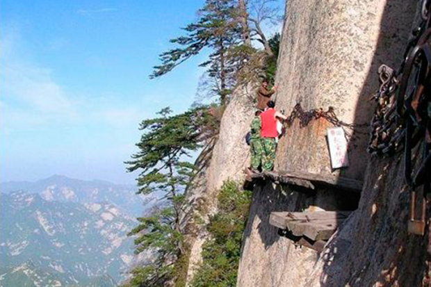 Essa trilha vai desde o sopé até o topo do Monte Huashan, na China, percorrendo uma distância de 6km e atingindo uma altura de 2100 metros. A rota é composta de tábuas finas, escadas íngremes e correntes. Até algum tempo atrás não se usavam equipamento de segurança para percorrer o caminho. Hoje, no entanto, se usa. Mas qualquer vacilo – um passo em falso, um desequilíbrio, a falha de alguma tábua – pode significar o fim da jornada. E não estamos falando da jornada rumo ao topo da montanha.